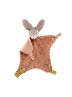 Przytulanka króliczek z kolekcji Trois Petits Lapins od Moulin Roty uszyta jest z miękkich i delikatnych tkanin przyjaznych skórze dziecka. Każdy róg królika jest zawiązany na supełek, aby ułatwić dziecku chwytanie. Duże futrzane uszy zaciekawią dziecko i zachęcą do zabawy. Materiał posiada delikatny wzorek z jednej strony. Można na nim wyhaftować imię dziecka. Zabawka pakowana jest w ozdobną papierową kopertę, ilustrowaną unikalnym  wzorem od Moulin Roty. Wiek: 0+Wysokość: 30 cmPielęgnacja: prać w 30 stopniach, w cyklu wełny. Nie suszyć w suszarce bębnowej.