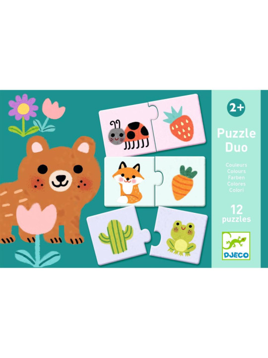Aby ułożyć puzzle w całość, należy połączyć dwa obiekty o tym samym kolorze. Pierwsza gra skojarzeniowa, która rozwija u dzieci umiejętności obserwacji. Puzzle są wykonane z wytrzymałej lakierowanej tektury. Zestaw Puzzle Duo zawiera 10 puzzli. Prosta i przyjemna pierwsza gra skojarzeń. Rozwija zmysł obserwacji. Produkt z papieru i tektury z certyfikatem FSC®. Wiek: +2 lata Wymiary opakowania: 18 x 12 x 6 cm Opakowanie zbiorcze: 12 szt.