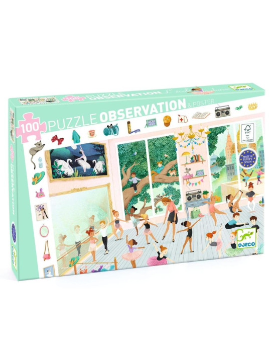 Tekturowe puzzle obserwacyjne z motywem SZKOŁY BALETOWEJ. Puzzle składające się ze 100 elementów, dzięki którym dzieci mogą odkryć szkołę tańca, w której młodzi tancerze ćwiczą, aby stać się przyszłymi gwiazdami baletu.Dokoła obrazka jest ramka, na której są umieszczone drobne rysunki, które dziecko  powinno odnaleźć na ułożonym obrazku. Walory edukacyjne: rozwój wyobraźni, spostrzegawczości. W zestawie znajduje się plakat wielkości puzzli. Wymiary obrazka po ułożeniu: 61 x 38cm Wiek +5 lataWymiary opakowania: 34 x 23 x 5 cm Wyprodukowano w Hiszpanii, papier z certyfikatem FSC. Produkt posiada oznaczenie CE. Opakowanie zbiorcze: 8 szt.