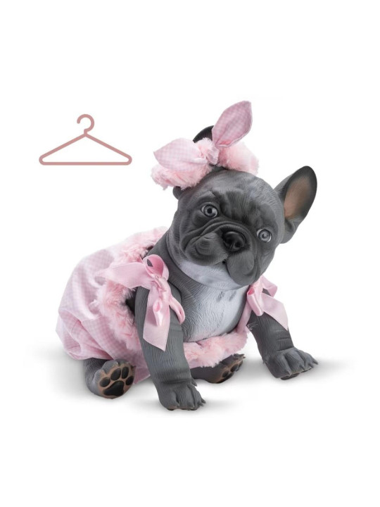 Biało-różowe ubranko na wiązanych ramiączkach, wykończone miękkim pluszem, zostało zaprojektowane specjalnie dla buldoga francuskiego o imieniu Lily oraz Nono z ekskluzywnej kolekcji Animal Reborn marki ASI. W komplecie także stylowa ozdoba na głowę.