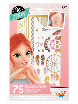 2 arkusze z około 75 zmywalnymi tatuażami z metalicznym połyskiem - łapacze snów, piórka, bransoletki.Wytnij wybrany tatuaż, oderwij folię zabezpieczającą i przyłóż do skóry.Zwilż wodą i poczekaj aż tatuaż odbije się na skórze. Liczba tatuaży zależy od sposobu, w jaki dziecko wytnie tatuaż. Wiek: +8 lat Wymiary opakowania: 15,2x0,1x25 cm.