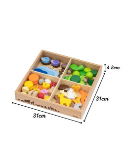- - 58 elementów drewnianych (figurki zwierząt i elementy przyrody)