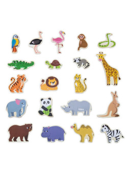 - - Ilość elementów: 20 drewnianych magnesów z motywem dzikich zwierząt