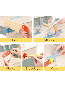 Drewniany warsztat majsterkowicza dla dzieci od Woopie Green to doskonała zabawka edukacyjna, która wprowadza najmłodszych w fascynujący świat konstruowania, napraw i odkrywania zasad działania narzędzi. Zestaw wykonany jest z wysokiej jakości drewna i bezpiecznych materiałów, gwarantując długą i bezpieczną zabawę. Dzięki licznym elementom i realistycznym detalom maluch może poczuć się jak prawdziwy mały inżynier lub konstruktor!Warsztat został wykonany z wysokiej jakości drewna, które jest przyjemne w dotyku, ekologiczne i w pełni bezpieczne dla dzieci. Starannie oszlifowane krawędzie i trwała konstrukcja gwarantują bezpieczeństwo i komfort podczas zabawy. Zabawka zachwyca dbałością o detale – znajdziesz tu prawdziwie wyglądające narzędzia, ruchome elementy, półki na akcesoria, a nawet zegar z obrotowymi wskazówkami i tablicę kredową do notowania pomysłów czy rysowania projektów. Każdy element został zaprojektowany z myślą o wszechstronnym rozwoju dziecka. Dzięki warsztatowi maluch poznaje zasady działania podstawowych narzędzi, rozwija zdolności manualne, uczy się logicznego myślenia i ćwiczy cierpliwość. To doskonały sposób, aby zachęcić dziecko do samodzielności i twórczego myślenia w codziennej zabawie.