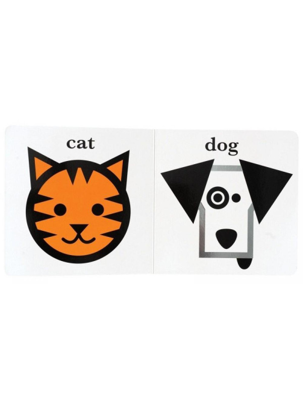 Książeczka z tektury "Zobacz i powiedz" Manhattan Toy z rysunkami i podpisami w języku angielskim. Książeczka ma 10 stron, które przedstawiają: słońce, dom, kota, psa, samochód, łódź, rybę, pszczołę, dziec