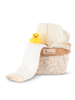 Hiszpańska kolekcja akcesoriów ASI Teresa zachwyca pomysłowością oraz stylowym i oryginalnym designem. Komplet zabawek w dwustronnym, jasnobeżowo-kakaowym szytym ręcznie, miękkim wyściełanym koszyczku zawiera: biały ręczniczek frotté, 2 pieluszki, myjkę oraz uroczą kaczuszkę. Całość zapakowana jest w woreczek tiulowy ozdobiony lśniącą satynową wstążeczką. Zestaw akcesoriów łazienkowych został zaprojektowany z myślą o dzieciach w wieku od lat trzech. Świetny do zabawy w odgrywanie ról. Pozwala dzieciom pielęgnować i kąpać swoje lalki tak, jakby były prawdziwymi niemowlakami.