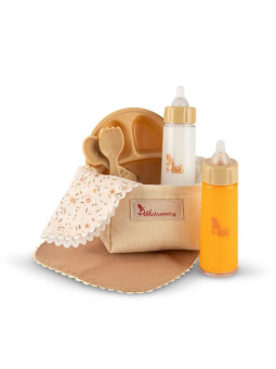 Zaprojektowany dla bobasów o wymiarach od 36 do 46 cm, zestaw akcesoriów hiszpańskiej marki ASI do karmienia lalek zawiera: talerzyk, sztućce, dwa śliniaczki z różnymi nadrukami oraz dwie magiczne buteleczki: jedną z "sokiem" i jedną z "mlekiem". Wszystko znajduje się w materiałowym jasnobeżowym koszyczku, który z kolei jest zapakowany w tiulowy woreczek prezentowy. Zabawka została zaprojektowana i wyprodukowana w Hiszpanii.