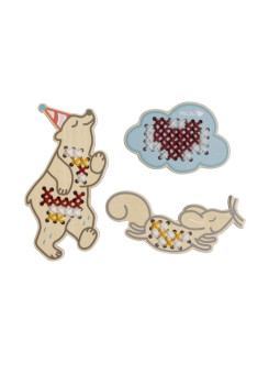 Odkryj radość z rękodzieła z klasycznymi drewnianymi szablonami do haftowania marki Micki! Ten poręczny zestaw jest idealny do zabrania na każdą rodzinną wyprawę. Zawiera 3 dziurkowane ramki w kształcie niedźwiedzia, myszki i chmurki, bezpieczną igłę oraz 9 metrów włóczki w 3 kolorach.
